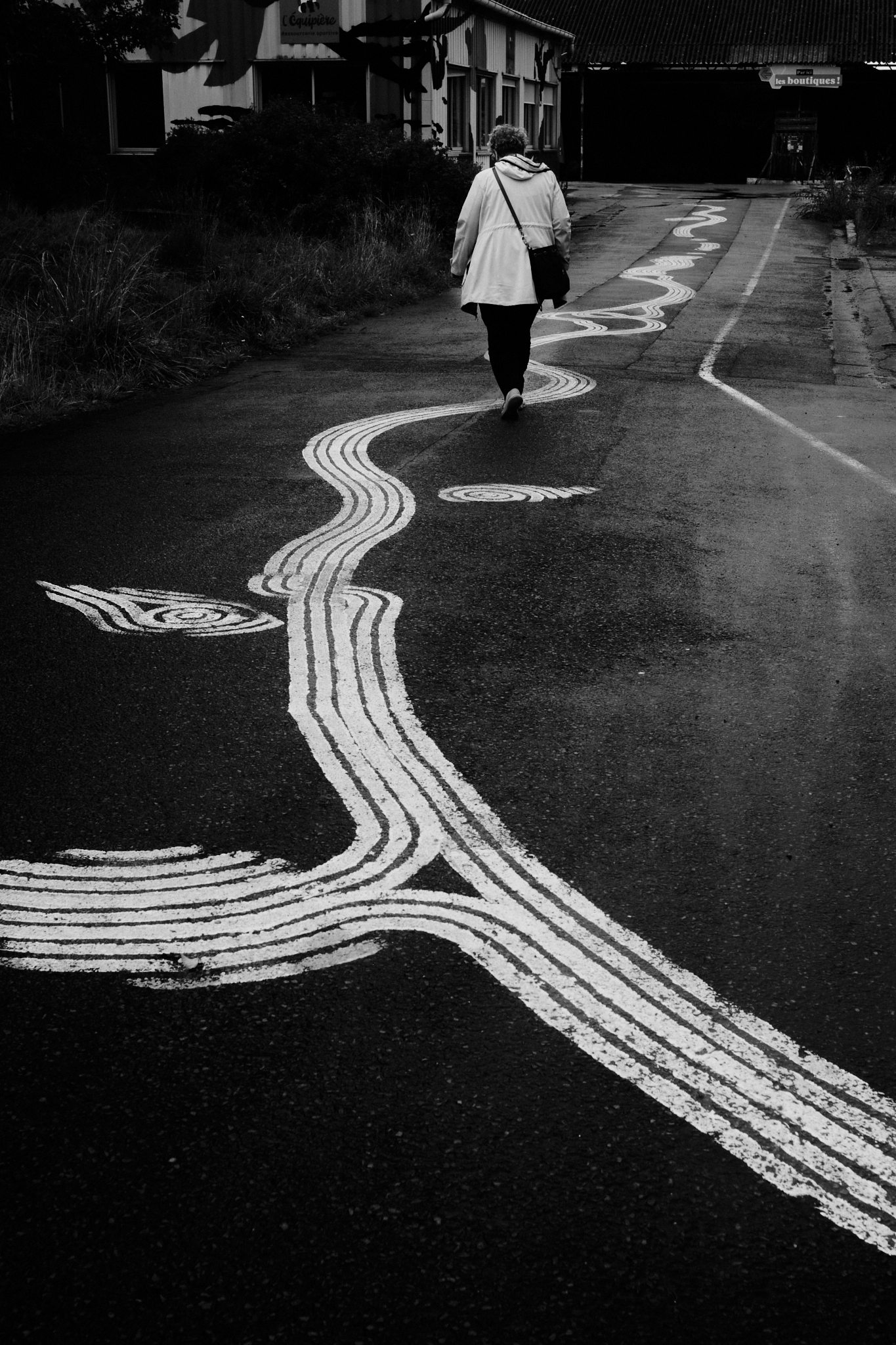 Les Halles en commun, La Courrouze. Cette dame s’en va au coeur de ce site en suivant le chemin tracé par un artiste qui ignorait sans doute tout de la ligne droite. Une petite averse est venue à point nommé pour renforcer les contrastes et permettre cette photo